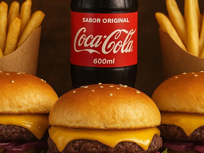 São 4 hamburgueres artesanais a sua escolha + 02 batatas médias + 01 Coca Cola 2l