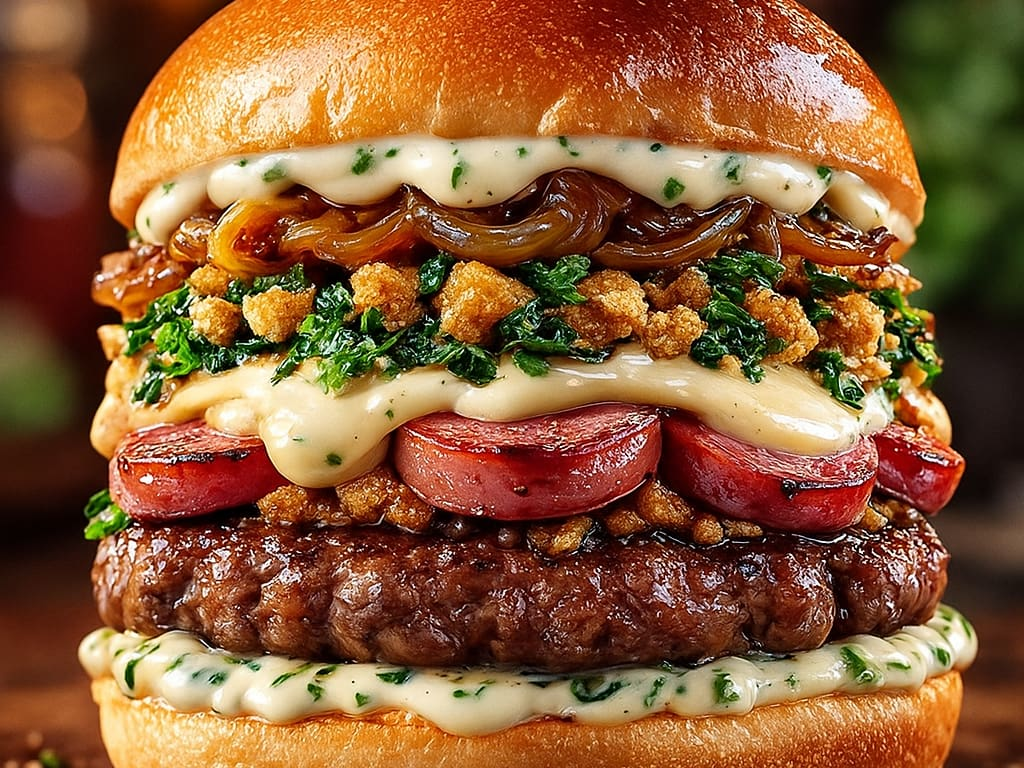 Blend de carne 100g, linguiça calabresa, Catupiry Original, cebola caramelizada, farofa de torresmo, couve crispy, maionese artesanal com alho e chimichurri (molho especial da casa).