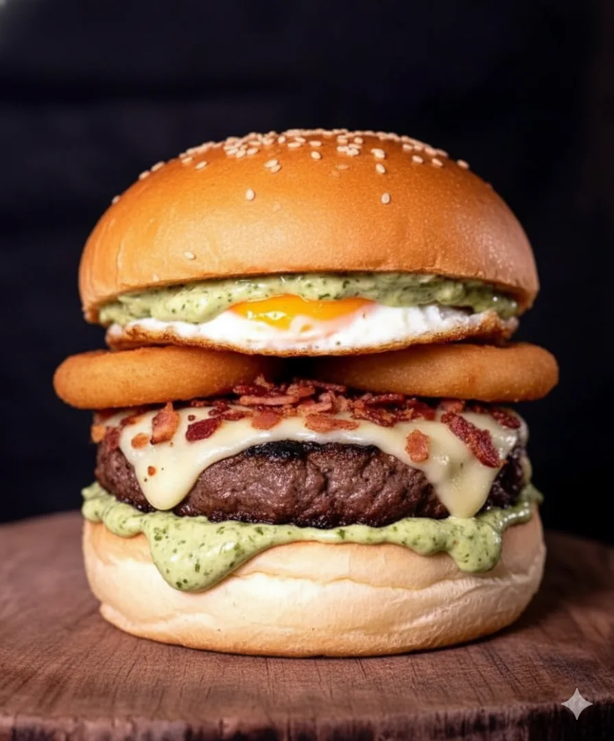 Carne suculenta 150g + queijo prato derretido (ou outra opção) + Catupiry Original + bacon defumado crocante picadinho + Onion rings + ovo na chapa + maionese estrondosa com chimichurri levemente defumada, (maionese da casa), pão brioche fofinho e tostado.